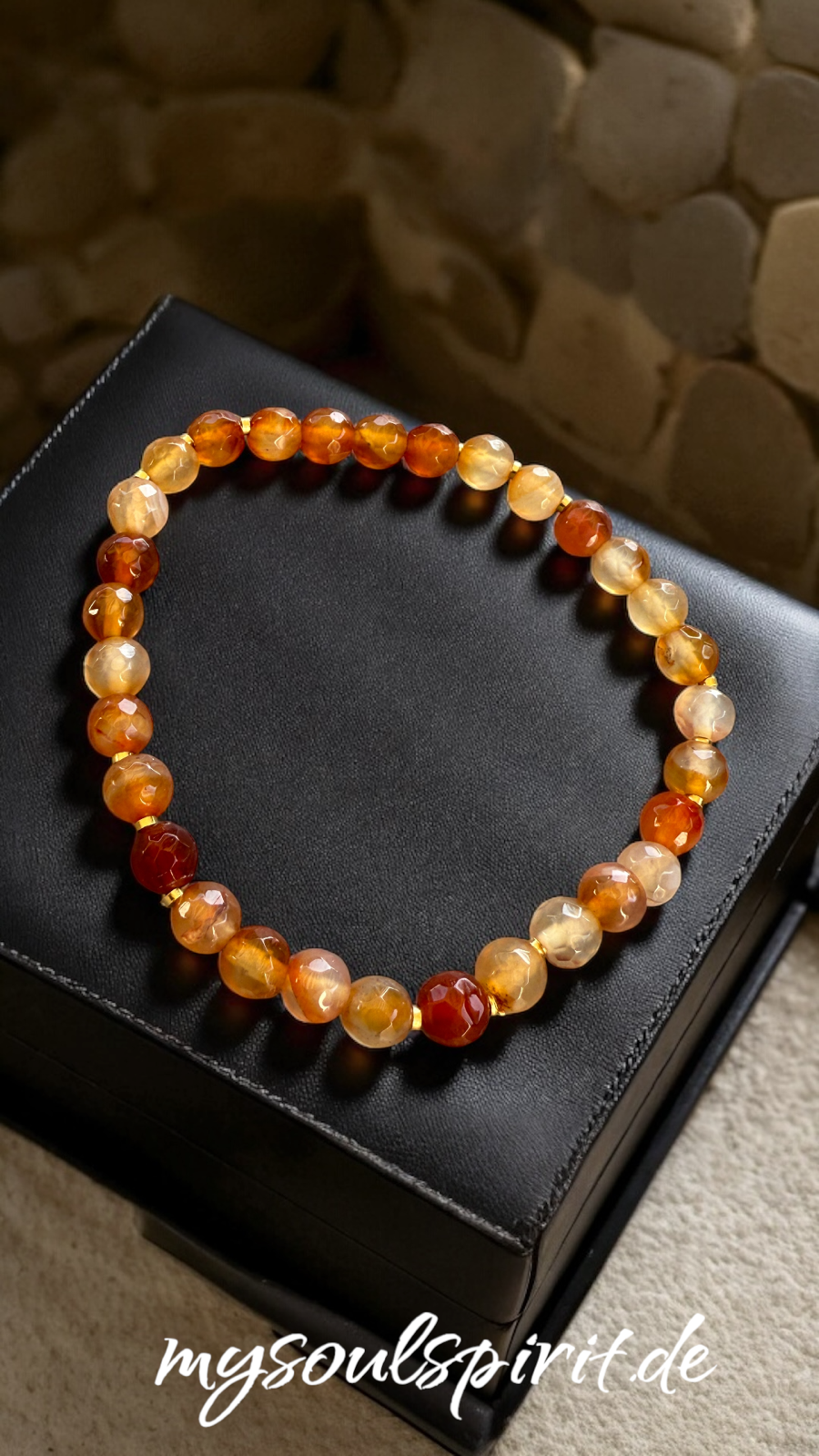 Dieses hochwertige Armband besteht aus 6 mm facettierten Karneol-Perlen, kombiniert mit vergoldeten Edelstahl-Elementen. Die funkelnde Oberfläche und warmen Orangetöne verleihen jedem Look eine lebendige und elegante Note.