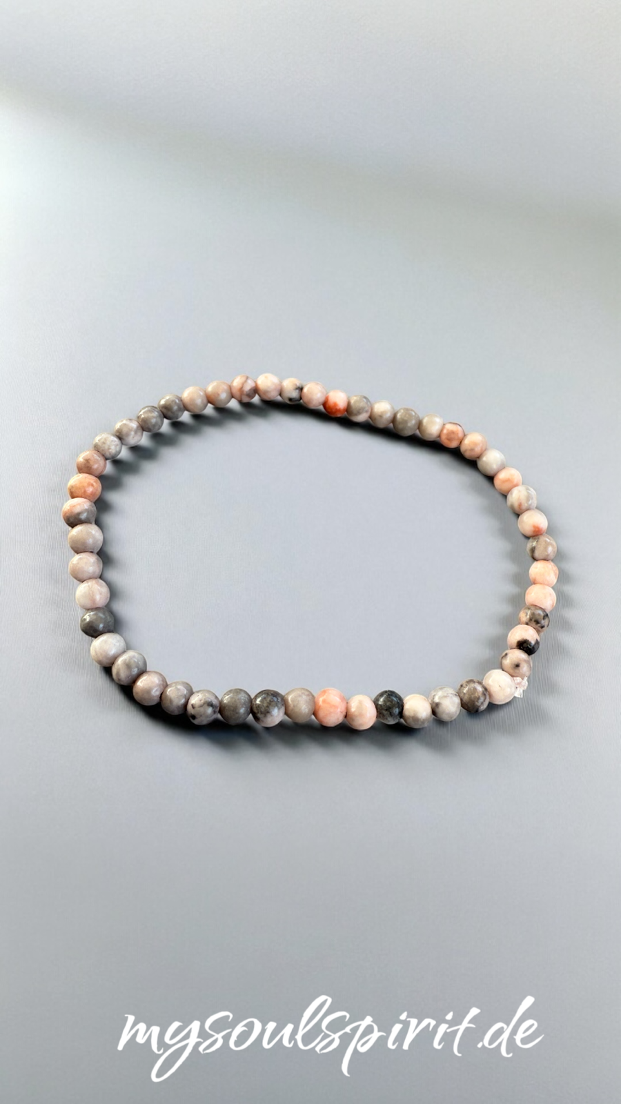 Dieses handgefertigte Armband besteht aus 4 mm großen Rhodonit-Perlen. Die sanften Rosatöne, durchzogen von feinen schwarzen Adern, machen es zu einem stilvollen Begleiter für Alltag und besondere Anlässe.