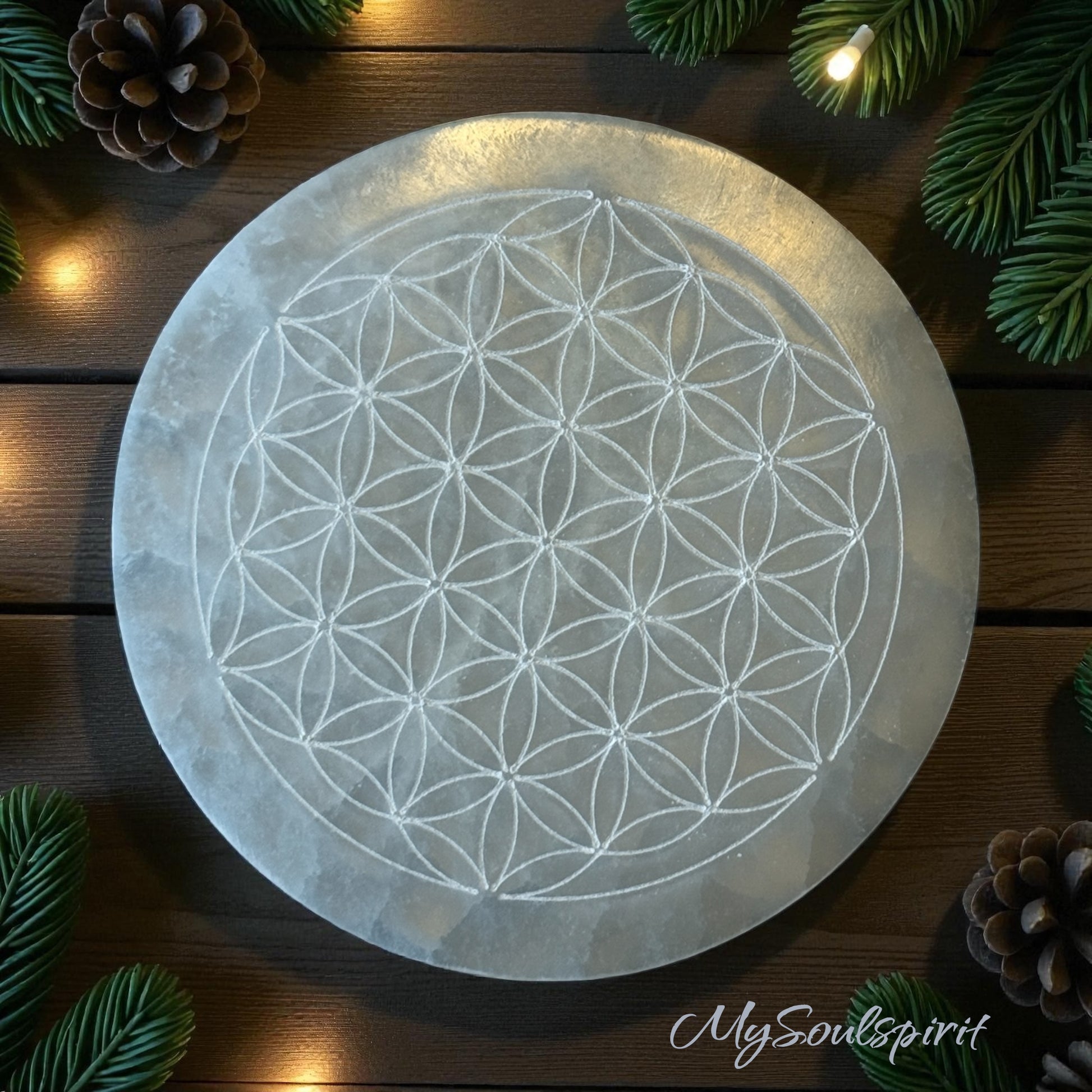 Selenit Ladeplatte & Untersetzer „Blume des Lebens“